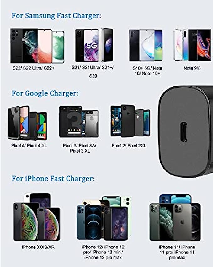 • Super Fast Charger Type C Universal : Optimized high-speed super fast charging Samsung Galaxy S22,S22Ultra,S22+,S21,S21+,S21Ultra,Z Fold 3 5G,Z Flip 3,Note 20,S10, S10+ Plus, S10 5G, S20, S9, S9+ Plus, S8, S8+ Plus / Active, Note 10,Note 10 plus, Google Pixel, Pixel 2, Pixel 3, Pixel XL, Pixel 2XL, Pixel 3XL, Pixel 4XL, Pixel 3A, LG G7 Thing, G8, G6, G5, Stylo 4, V20, V30, V35, V30S, V40 ThinQ Plus,2018 and up iPad Pro 12.9, 11 and More. (usb c charger, type c fast charger)