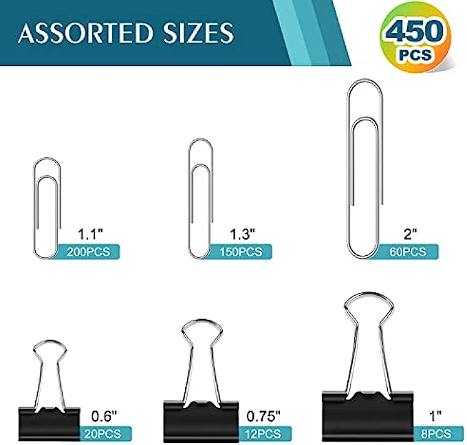 • Assorted Sizes: Including 200 pieces 1.1'' , 150 pieces 1.3'', 60 pieces 2'' paper clips, 20 pieces 0.6'', 12 pieces 0.75'' , 8 1'' binders. Three sizes of large, medium and small meet your different needs and manage files of different thicknesses and sizes.
