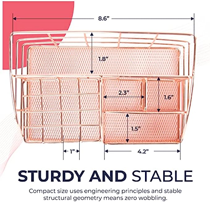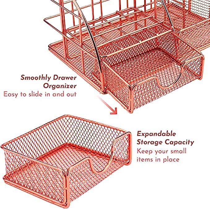 • ⭐ STYLISH ROSE GOLD DESIGN: A stunning combination of wire mesh and chic rose gold coating adds eye-catching vibrancy to any room. Modern style meets classic function in this cute desk organizer. Desktop organization just got an elegant new makeover