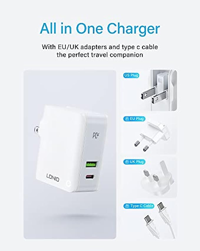 【What you get】1 x LDNIO 32W wall charger, 1 x UK Plug, 1 x EU Plug, 1 x 3.2FT USB C to C Cable, LDNIO 1-YEAR warranty. If you have any questions about our charger, please feel free to contact us.