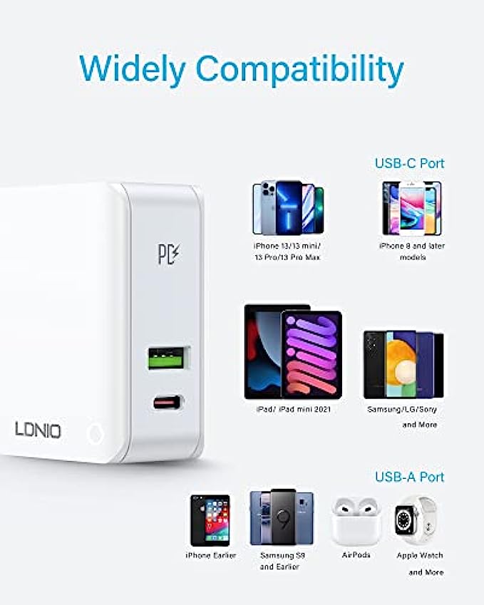 【Widely Comparability】This fast charging block is compatible with iPhone 13 Pro Max/13 Pro/12 Pro Max/12 Pro, iPad Air/iPad Pro, Macbook, AirPods and other smartphones, tablets, accessories. (Please Notice the USB-A Port is not a Fast Charging Port(12W Max), you can use this port charging for your old model phone and other accessories like Apple Watch or AirPods).