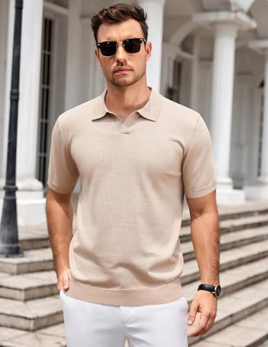 Mens Knit Polo Shirts V Neck Short Sleeve Stretch Polo T Shirt Casual Golf Shirts