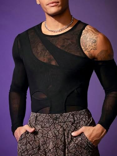 Men's Cold Shoulder Hollow Out Long Sleeve Mesh Tee Slim Fit Sheer Asymmetrical Neck T Shirt Clubwear