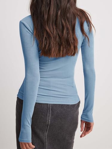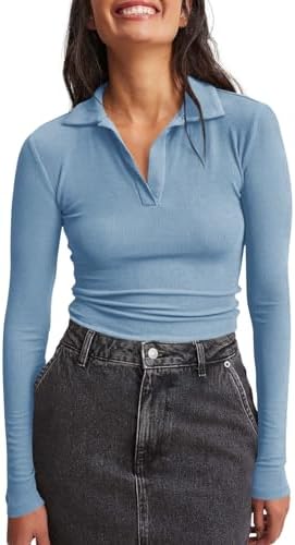 Womens Long Sleeve Polo Shirts V Neck Collared Work Shirt Slim Fit Ribbed Knit Basic Going Out Fall Tops
