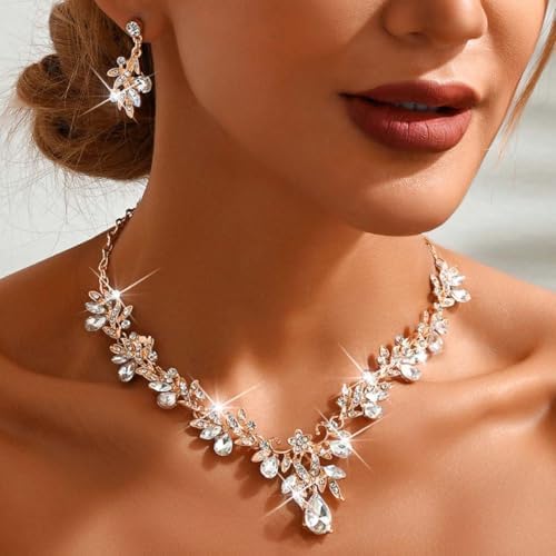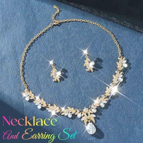 Unicra Rhinestone Bridal Wedding Jewelry Sets Gold Necklace Earrings Set Leaf Prom Formal Costume Jewelry Set for Women and Brides